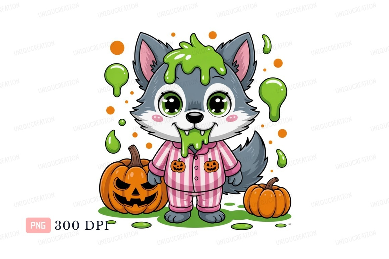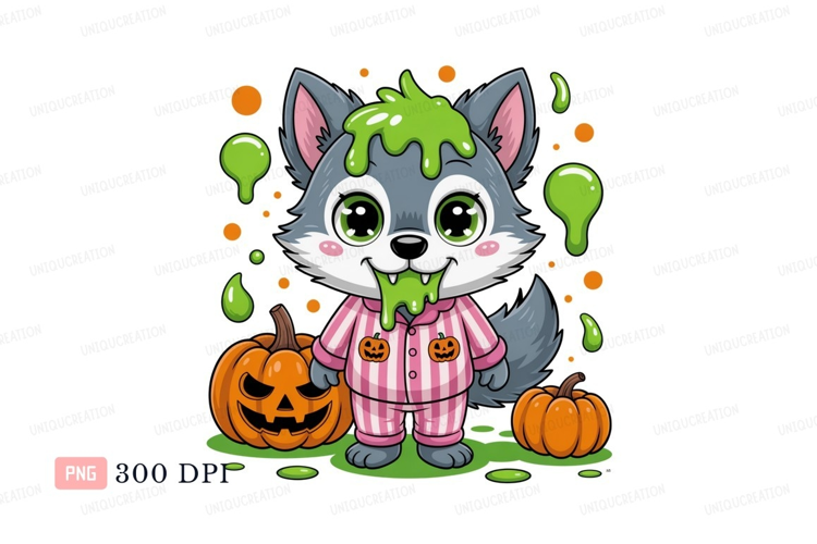 Cute wolf in pajamas with slime and pumpkins green example image 1