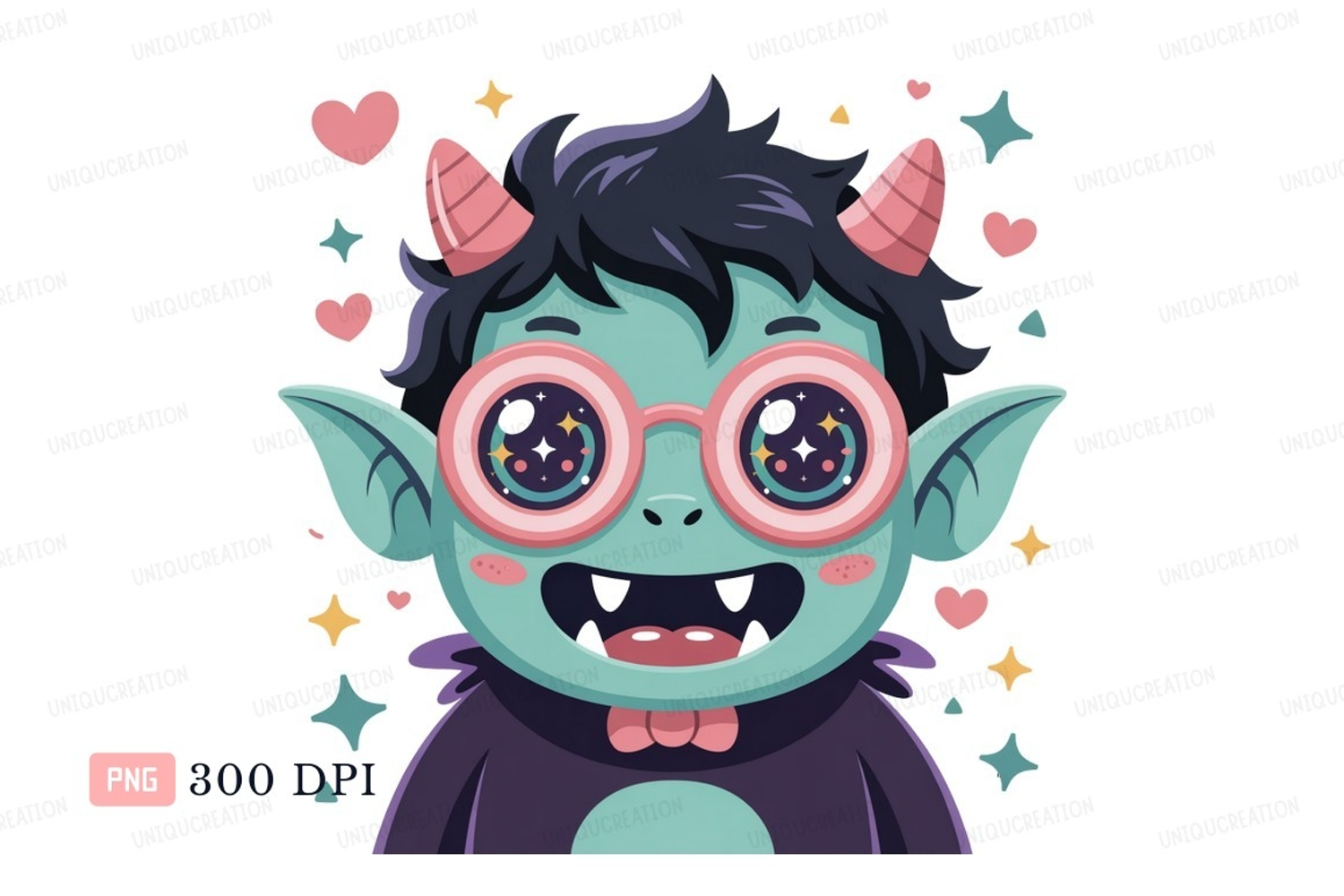 Cartoon Cute Pink Hearts Purple Horns Teal Glasses Monster Stars
