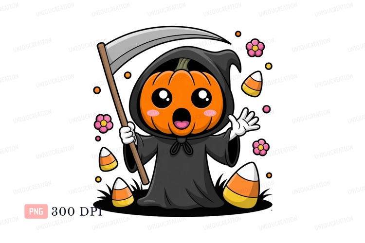 Cute pumpkin grim reaper with scythe and candy halloween example image 1