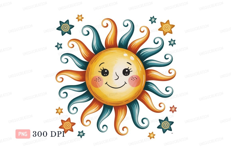 Cartoon Playful Black Sun Celestial Orange Yellow Teal Stars Smiling