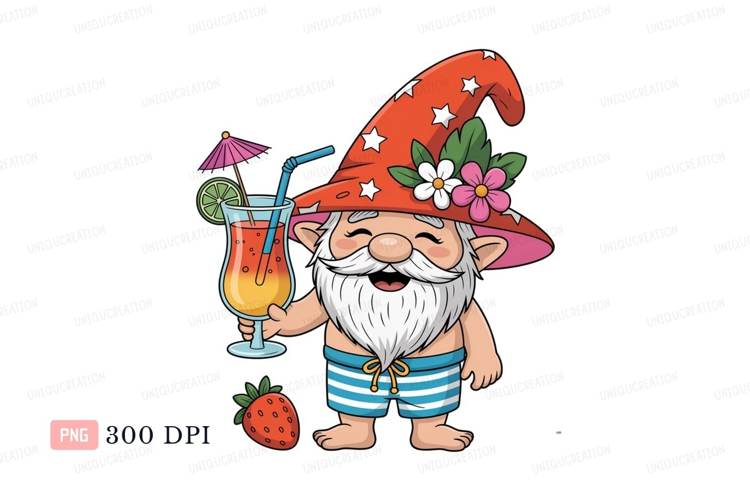 Cheerful gnome with cocktail and strawberry summer example image 1