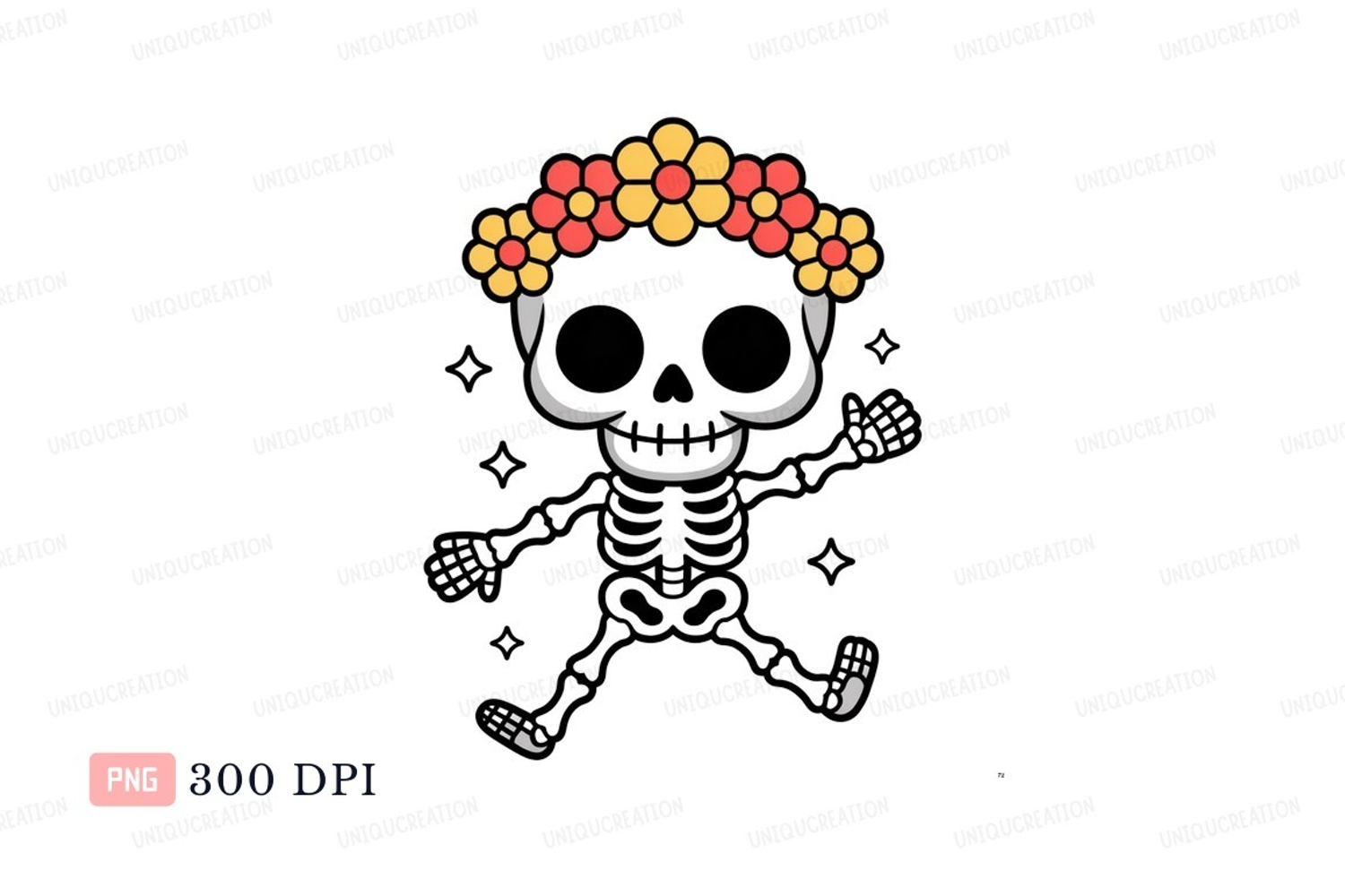 Dancing skeleton wearing flower crown celebration example image 1