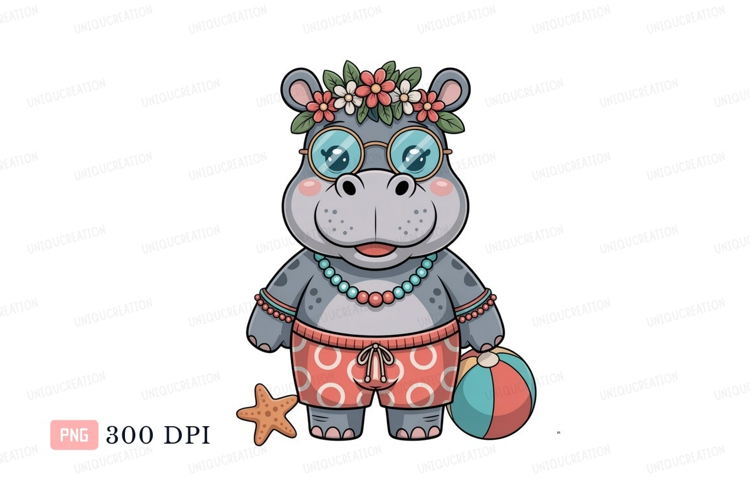 Hippopotamus wearing flowers sunglasses and beach shorts example image 1