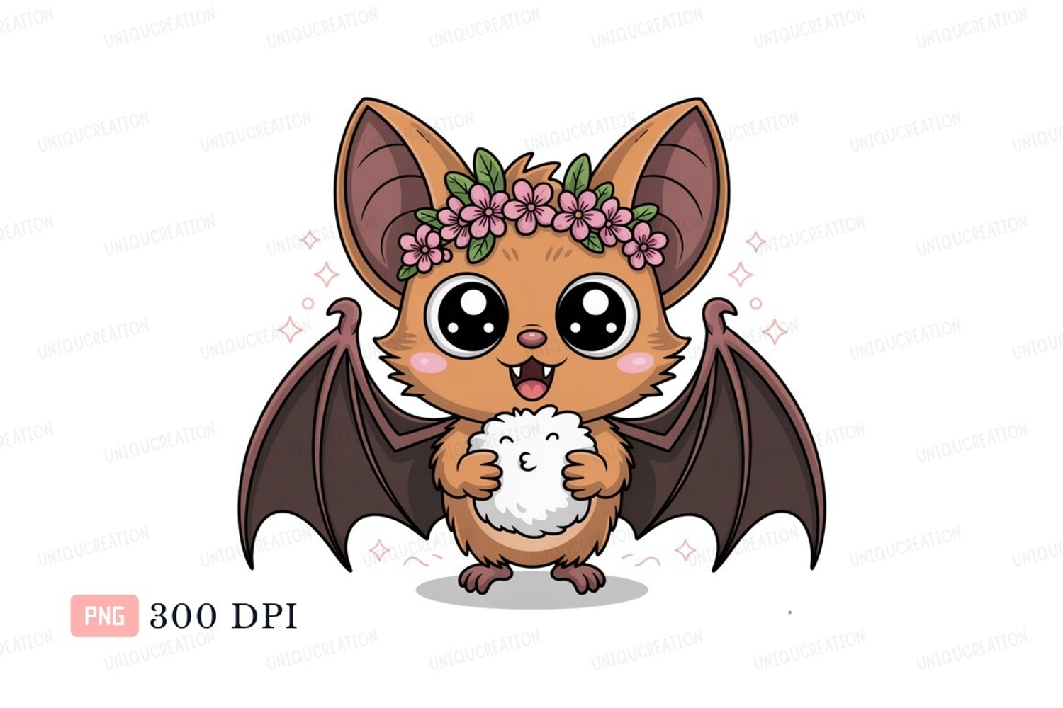 Cute bat wearing flower crown holding fluffy ball cartoon example image 1