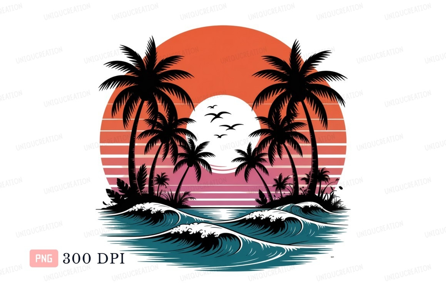 Retro Ocean Silhouette Beach Sunset Tropical Trees Island Palm Waves