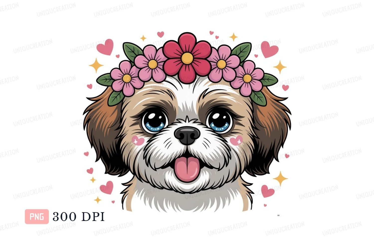 Cartoon Cute Pink Hearts Flower Crown Blue Puppy Dog Stars