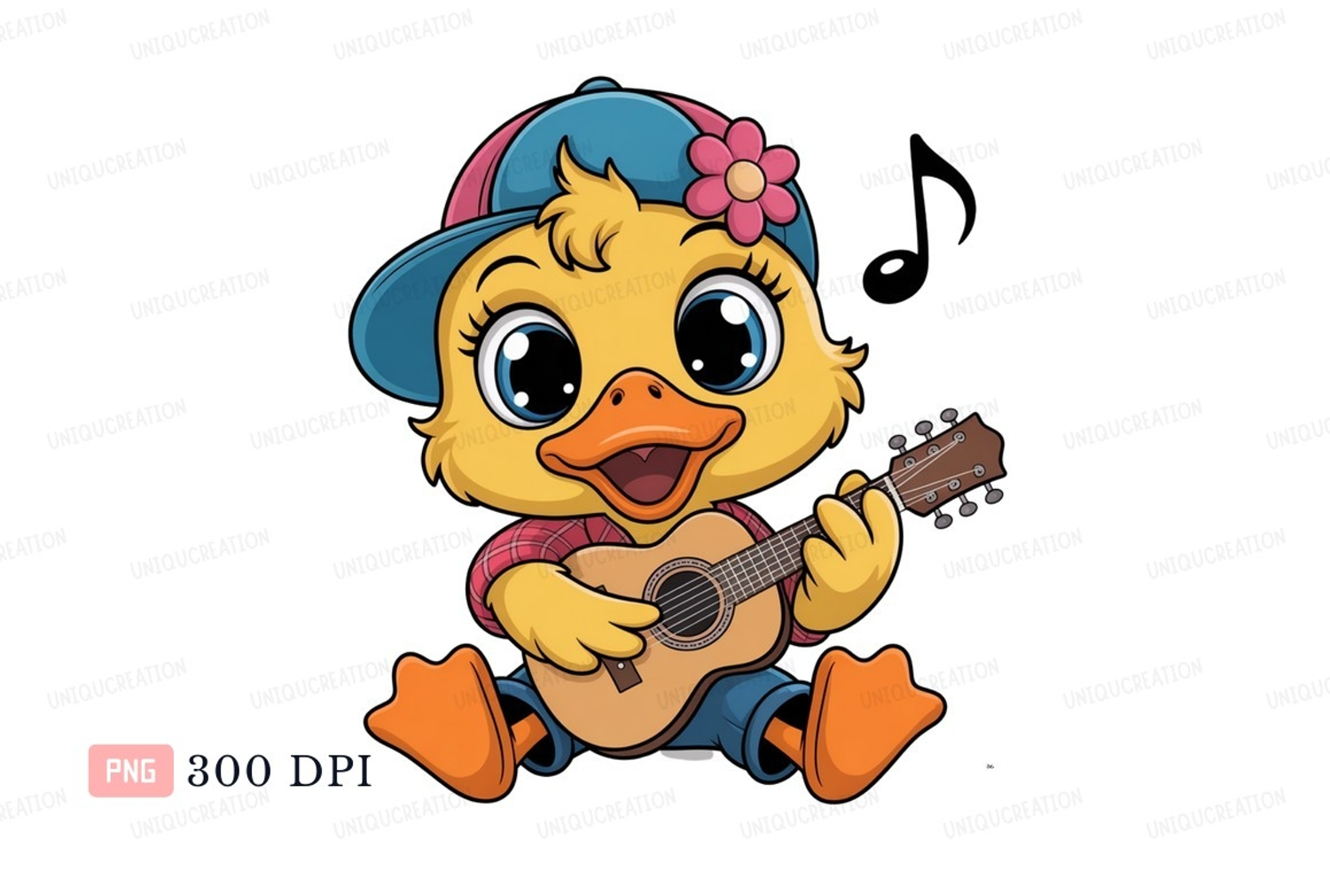 Cartoon Cute Music Pink Guitar Blue Yellow Bird Duckling Playing