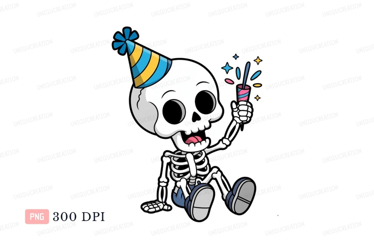Skeleton wearing party hat holding popper celebration example image 1