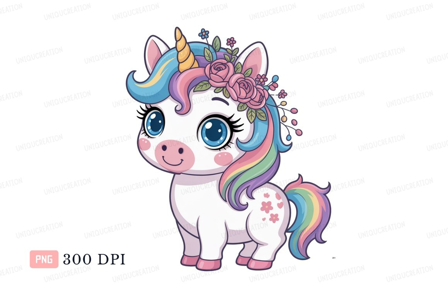 Cute unicorn with rainbow mane and floral crown tail