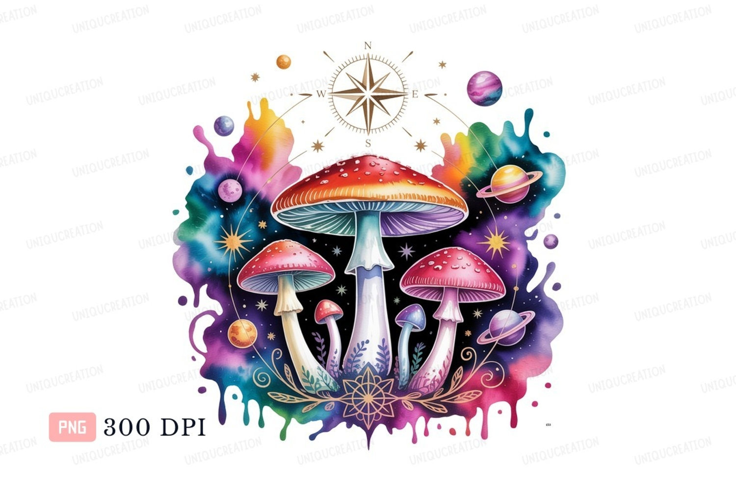 Psychedelic mushrooms cosmic watercolor planets example image 1
