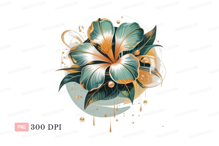 Art Gold Flower Abstract Leaves Botanical Orange Teal Petals Droplets