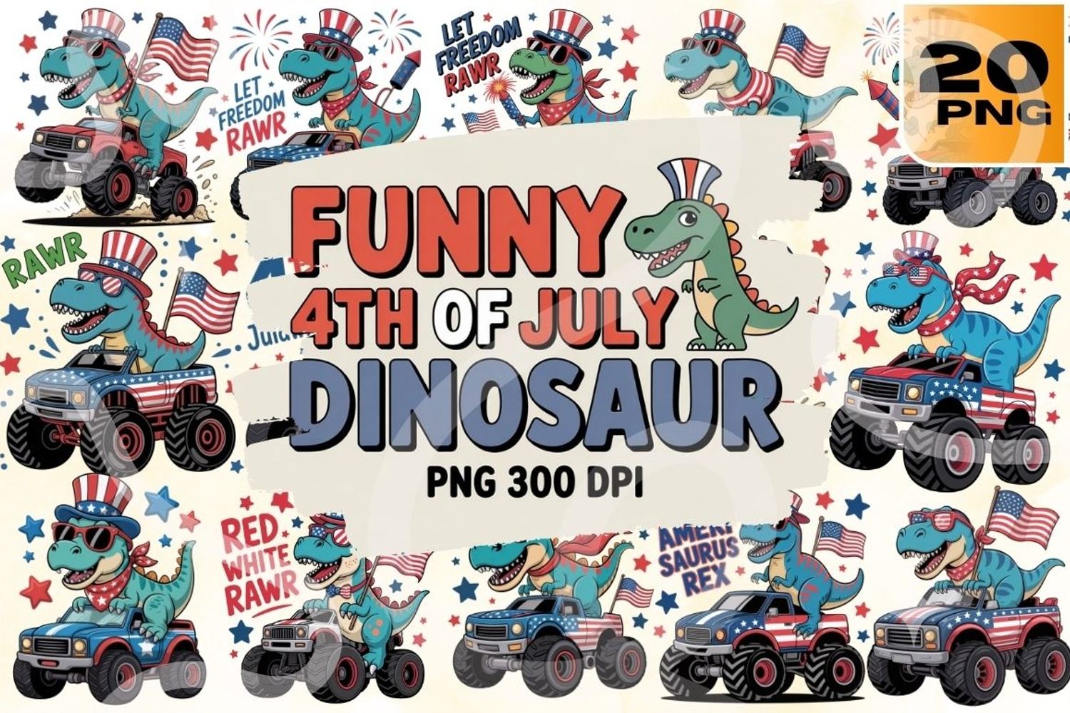 Celebrate Independence Day with prehistoric punchlines using this Funny 4th of July Dinosaur Sublimation Bundle! Featuring 20 high-resolution PNG files, this collection combines cartoon dinosaurs and monster trucks decked out in stars, stripes, and sass—think “LET FREEDOM RAWR,” “AMERICASAURUS REX,” “RED WHITE RAWR,” and more. With Uncle Sam hats, sunglasses, flags, fireworks, and roaring attitude, each design is perfect for T-shirts, mugs, tote bags, tumblers, party decor, and kid-friendly patriotic merch.