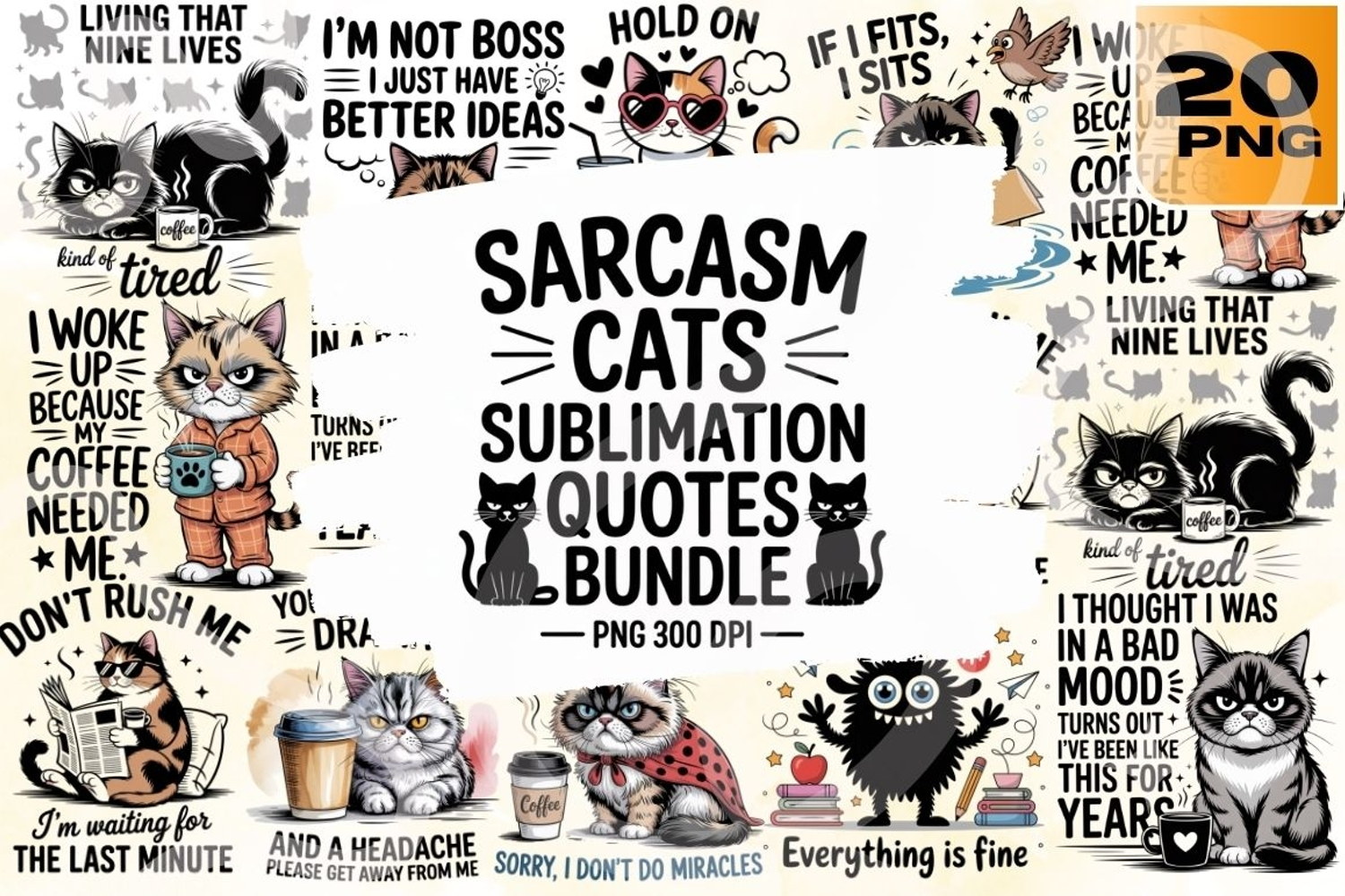 Serve up sass with this Sarcasm Cats Sublimation Quotes Bundle! Featuring 20 high-resolution PNG files, this collection pairs snarky one-liners with expressive cartoon cats—think “I’m not bossy I just have better ideas,” “Hold on let me overthink this,” “I need coffee right meow,” and “I’ve been in a bad mood for years.” With exaggerated poses, bold fonts, and feline flair, each design is perfect for T-shirts, mugs, tote bags, tumblers, and pet-lover merch with attitude.