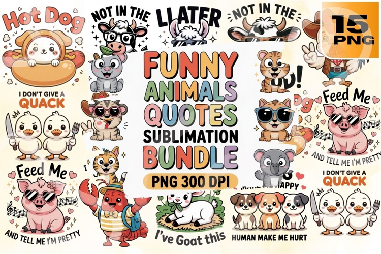Bring the laughs with this Funny Animals Quotes Sublimation Bundle! Featuring 15 high-resolution PNG files, this collection pairs expressive cartoon animals with cheeky, sarcastic, and playful quotes—think “I don’t give a QUACK,” “Not in the MOOd,” “I’m Not Short I’m Koala-fied,” and “Feed Me and Tell Me I’m Pretty.” With hot dogs, ducks, crabs, llamas, cows, cats, dogs, and koalas decked out in sunglasses, bows, and hats, each design is perfect for T-shirts, mugs, tote bags, tumblers, planners, and novelty merch.