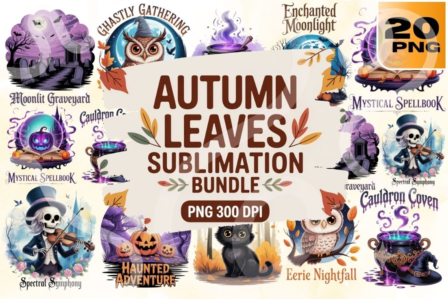 Celebrate the eerie side of fall with this Autumn Leaves Sublimation Bundle! Featuring 20 high-resolution PNG files, this collection blends cozy seasonal vibes with whimsical Halloween flair—think “Haunted Adventure,” “Moonlit Graveyard,” “Cauldron Coven,” “Mystical Spellbook,” and “Ghastly Gathering.” With pumpkins, ghosts, owls, cauldrons, and enchanted landscapes, each design is perfect for T-shirts, mugs, tote bags, tumblers, planners, and autumn merch with a magical twist.