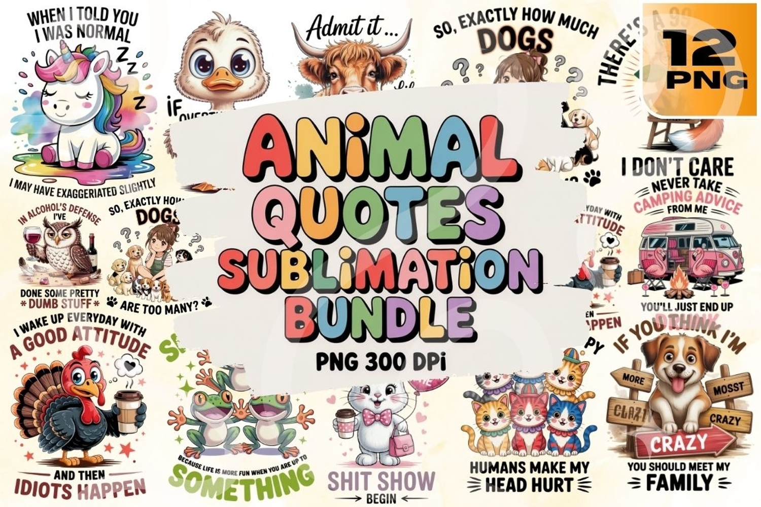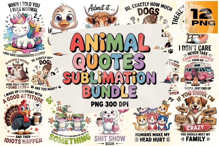 Add wild wit to your designs with this Animal Quotes Sublimation Bundle! Featuring 12 high-resolution PNG files, this collection delivers cartoon-style animals paired with hilarious, sarcastic, and motivational quotes—think “Be the person your dog thinks you are,” “When I told you I was normal… I may have exaggerated,” and “Don’t piss off old people… prison isn’t a deterrent.” With unicorns, raccoons, dogs, cats, ducks, and more, each design is perfect for T-shirts, mugs, tote bags, tumblers, planners, and novelty merch.