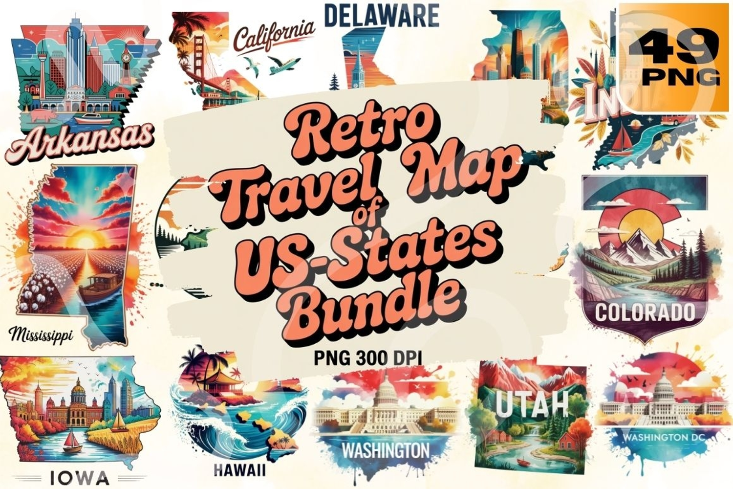 Explore America with nostalgic flair using this Retro Travel Map of US States Bundle! Featuring 49 high-resolution PNG files, this collection showcases each U.S. state in a vibrant retro style—complete with iconic landmarks, landscapes, and cultural motifs. From California’s coastlines to Colorado’s mountains, Hawaii’s tropical vibes to Washington D.C.’s monuments, each map is perfect for T-shirts, mugs, tote bags, travel journals, and regional merch.