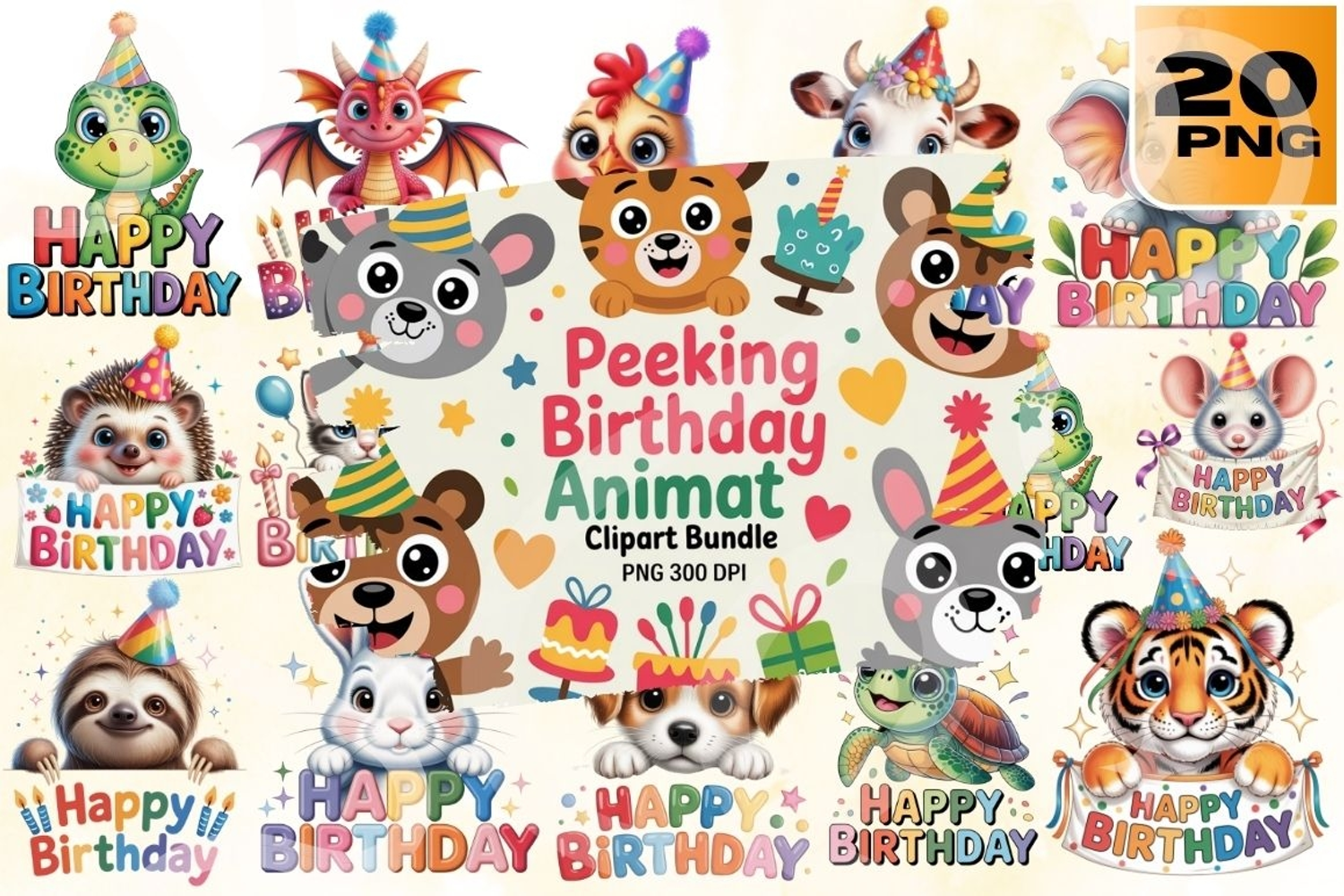 Add playful charm to birthday designs with this Peeking Birthday Animal Clipart Bundle! Featuring 20 high-resolution PNG files, this collection showcases adorable animals like cats, dogs, rabbits, tigers, bears, dragons, and mice—all peeking out in party hats with colorful “Happy Birthday” text. Perfect for T-shirts, mugs, invitations, banners, tote bags, and kids’ birthday merch.