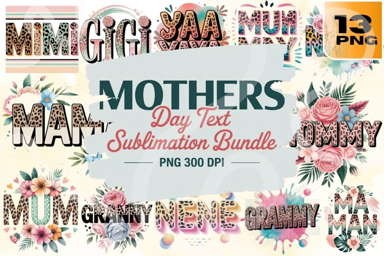 Celebrate every kind of mama with this Mothers Day Text Sublimation Bundle! Featuring 13 high-resolution PNG files, this collection showcases beloved titles like “MOM,” “MIMI,” “GIGI,” “YAYA,” “MUM,” “MAM,” “MOMMY,” “GRAMMY,” and “NENE”—each styled with pastel florals and soft decorative accents. Perfect for T-shirts, mugs, tote bags, tumblers, and personalized gifts for moms, grandmas, and caregivers.
