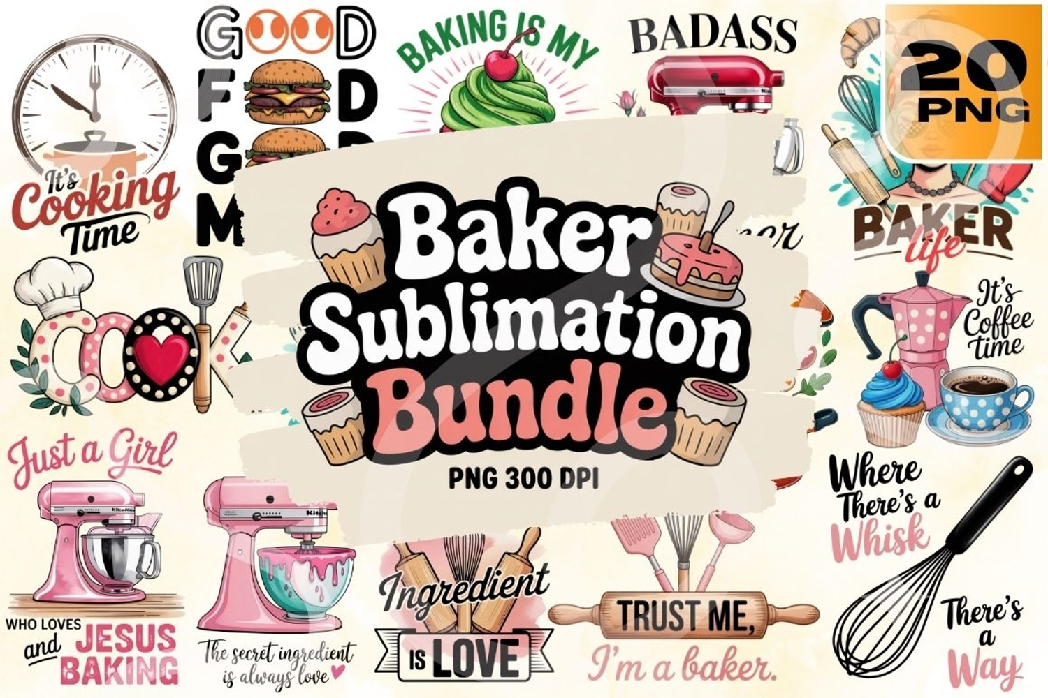 Bake up some joy with this Baker Sublimation Bundle! Featuring 20 high-resolution PNG files, this collection is filled with witty quotes and colorful baking-themed illustrations—think “Baking Is My Superpower,” “Where There’s a Whisk There’s a Way,” “Baker,” “Trust Me, I’m a Baker,” and “The Secret Ingredient Is Always Love.” With cupcakes, whisks, rolling pins, mixers, and coffee cups, each design is perfect for T-shirts, mugs, tote bags, tumblers, kitchen wall art, and foodie merch.