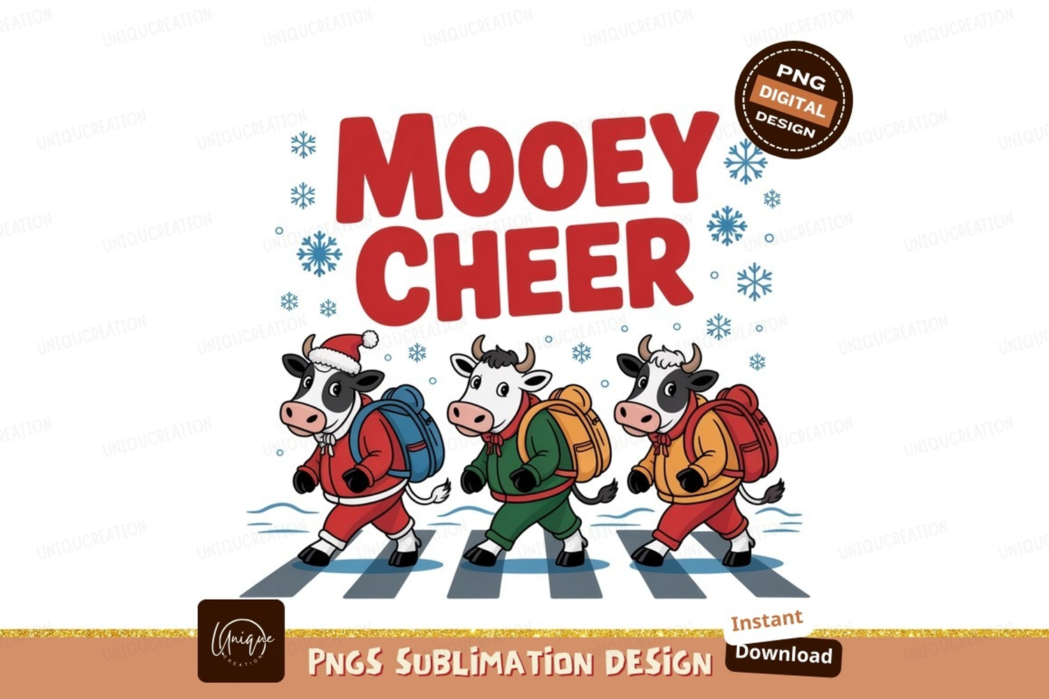 Festive cows walking across street snow