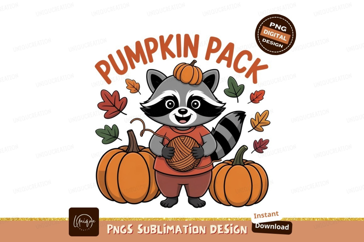 Cute raccoon knitting with pumpkins and leaves yarn example image 1
