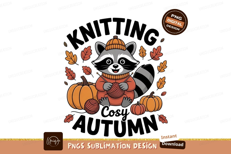 Raccoon knitting autumn leaves pumpkins fall example image 1