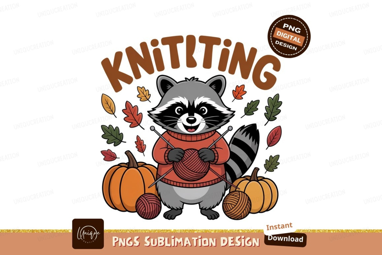 Raccoon knitting autumn sweater leaves pumpkins example image 1