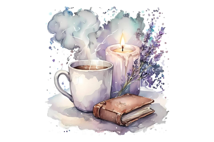 Pastel Watercolor Coffee Mug Art Self Care Clipart Journal Illustration Mental Health Art Cozy Aesthetic Mindfulness Art Lavender Candle Relaxation Graphics Watercolor Wellness