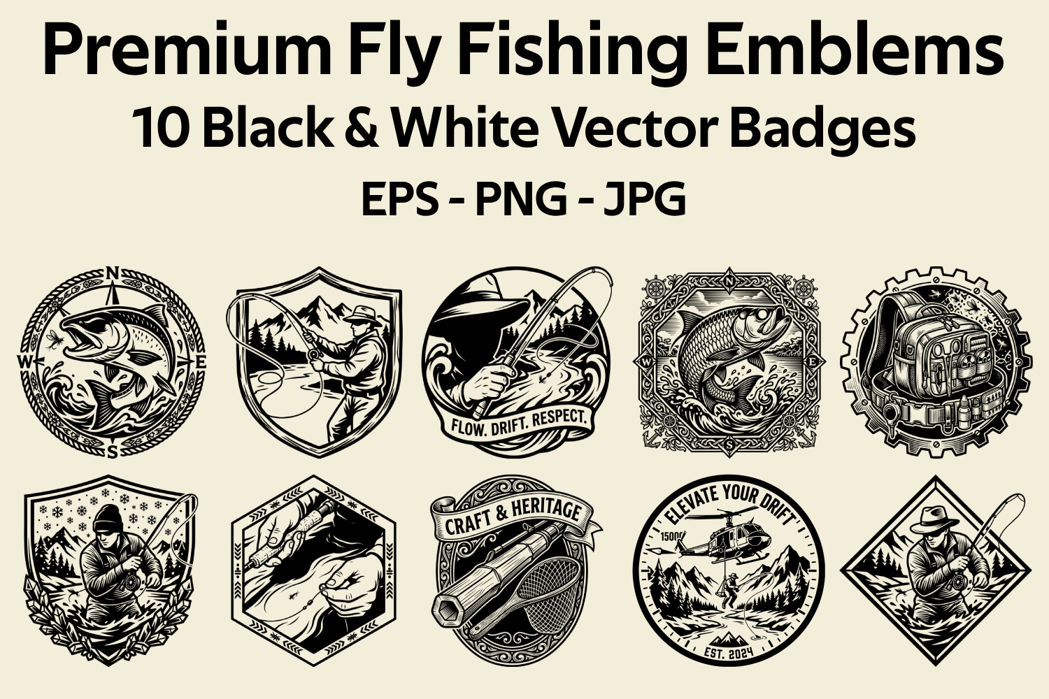 Premium Fly Fishing Emblems: 10 Black & White Vector Badges