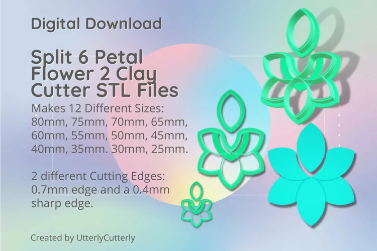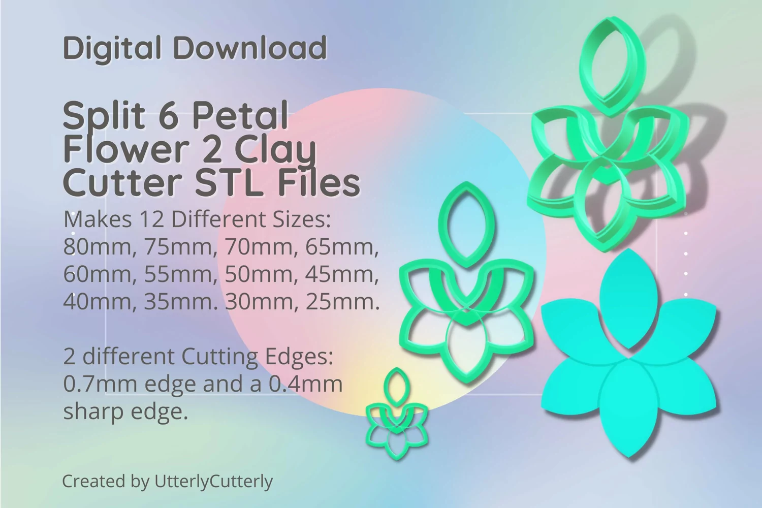 A bundle of 6 petal split flower shape clay cutters in a digital download STL file.