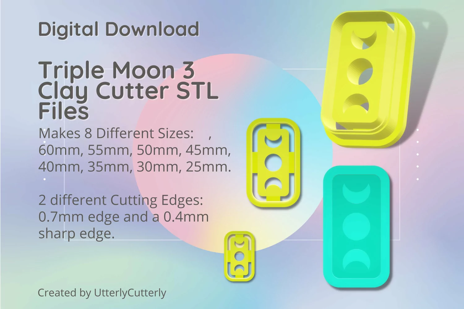A bundle of triple moon shape clay cutters in a digital download STL file.
