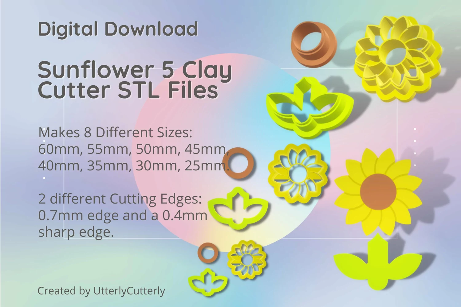 A bundle of sunflower shape clay cutters in a digital download STL file.