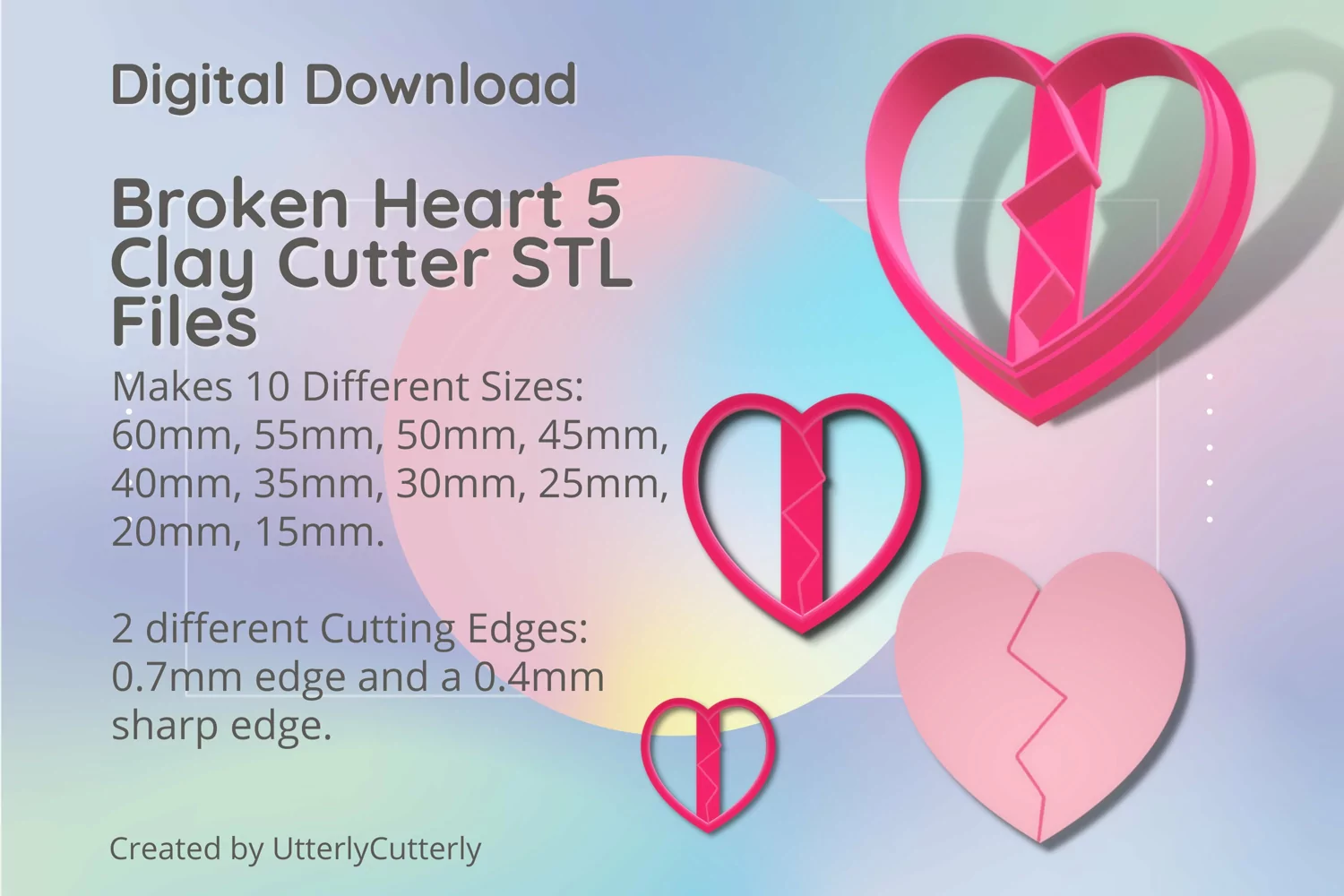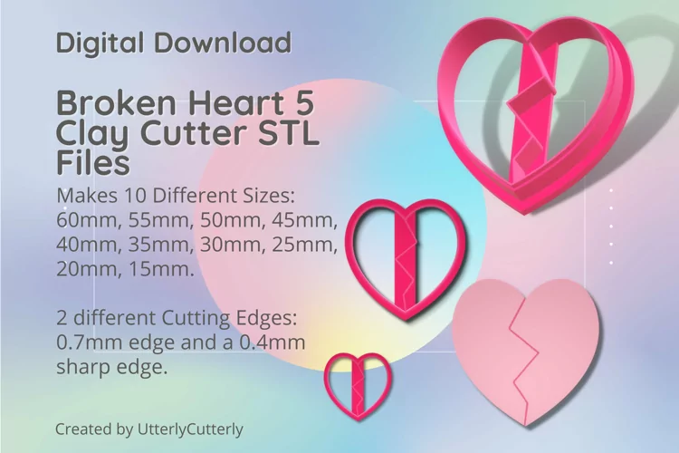 A bundle of broken heart clay cutters in a digital download STL file.
