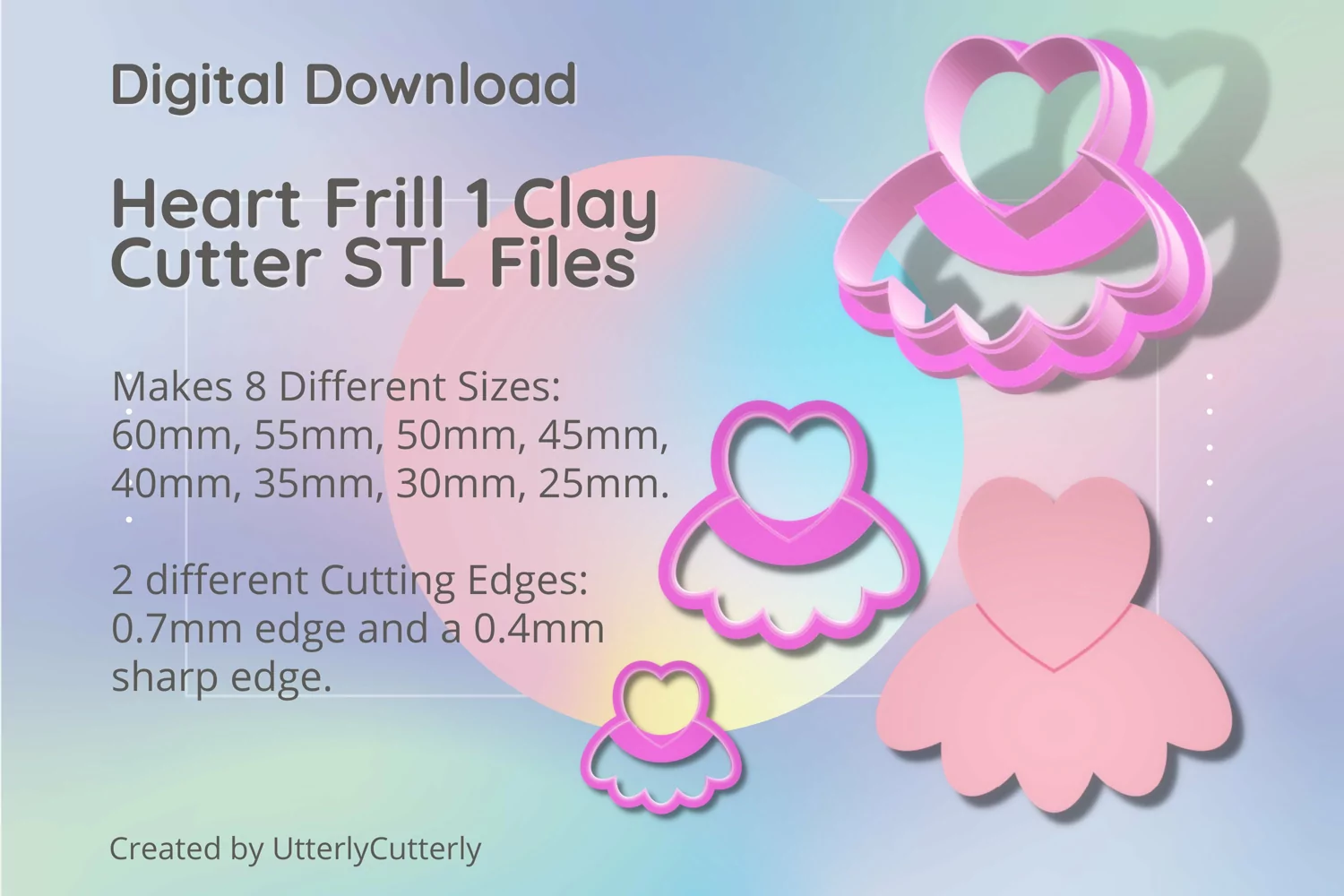 A bundle of heart frill clay cutters in a digital download STL file.