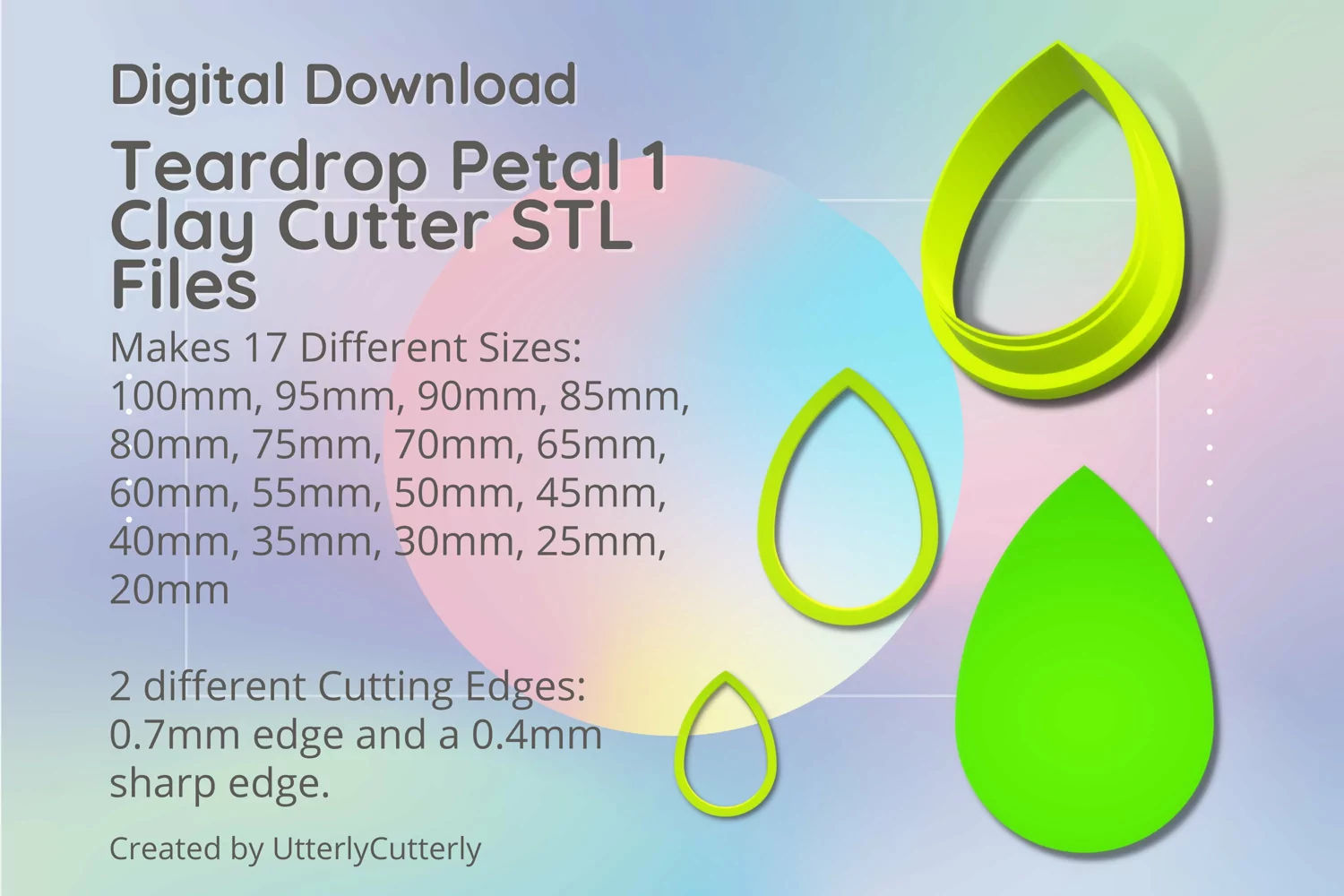 A bundle of teardrop petal shape clay cutters in a digital download STL file.