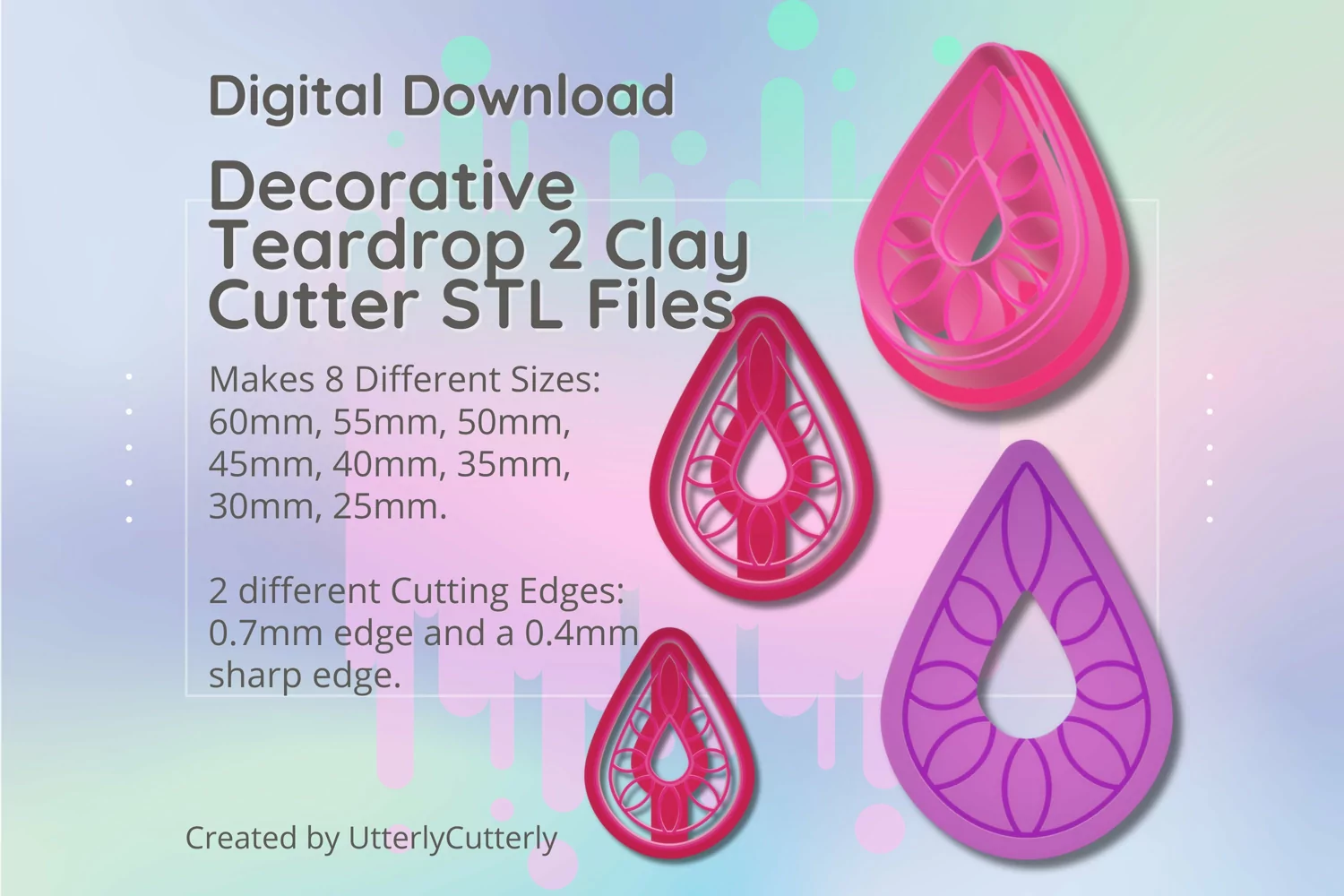 A bundle of clay cutter stl digital download files for earrings and cookies in a decorative teardrop shape design. Perfect for making earrings, pendant, barrettes, cookies, fondant decorations