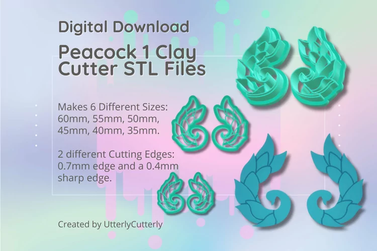 A bundle of elegant peacock clay cutters in a digital download STL file. Perfect for making earrings, pendant, barrettes, cookies, fondant, christmas decorations as gifts for you or loved ones.