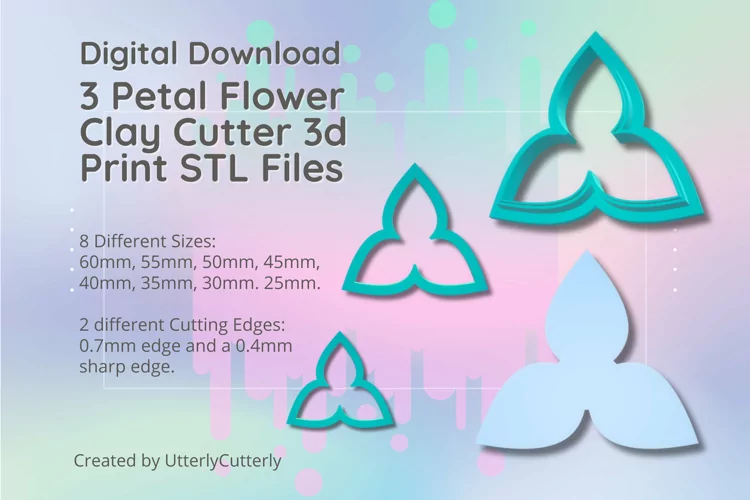 A bundle of 3 petal flower clay cutters in a digital download STL file.