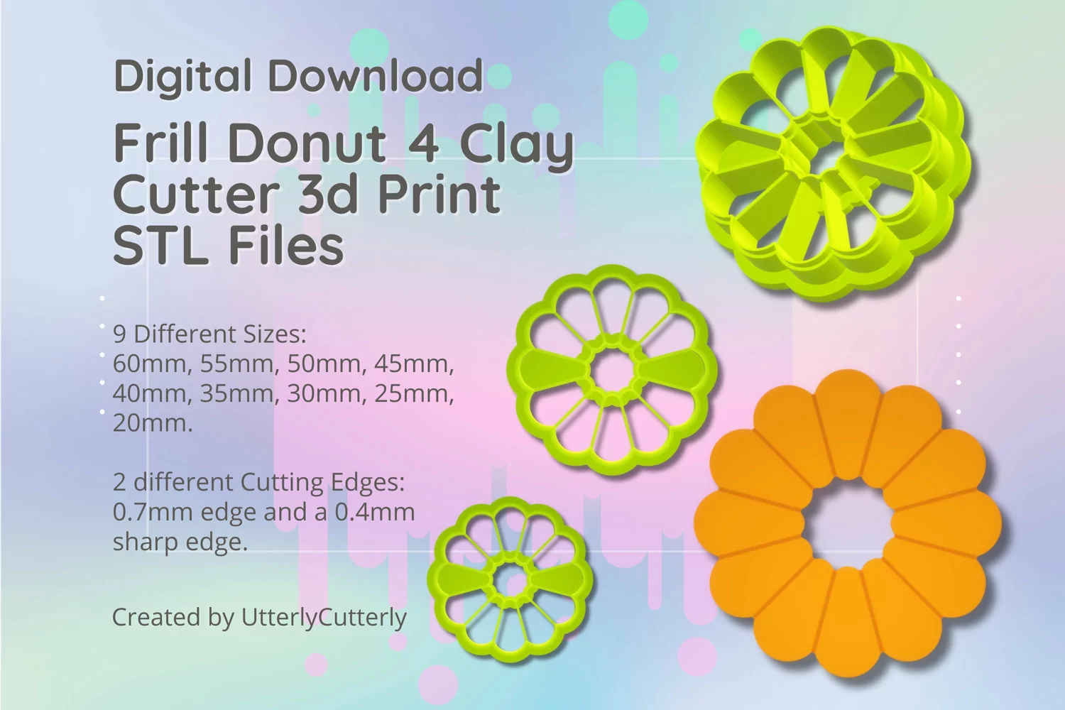 A bundle of flower frill donut thin clay cutters in a digital download STL file. Perfect for making earrings, pendant, barrettes, cookies, fondant, christmas decorations as gifts for you or loved ones.