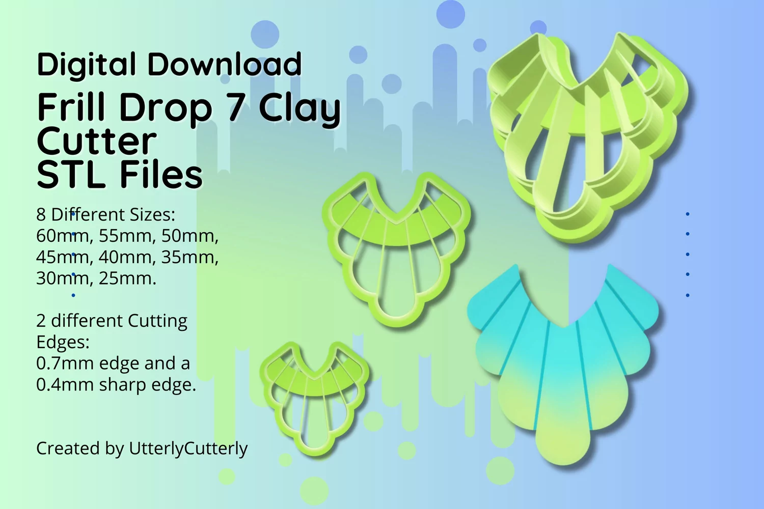 A bundle of frill drop clay cutters in a digital download STL file. Perfect for making earrings, pendant, barrettes, cookies, fondant, decorations as gifts for you or loved ones.