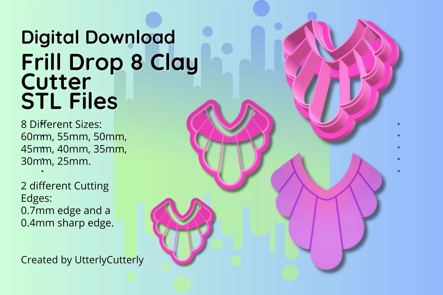 A bundle of frill drop clay cutters in a digital download STL file. Perfect for making earrings, pendant, barrettes, cookies, fondant, decorations as gifts for you or loved ones.