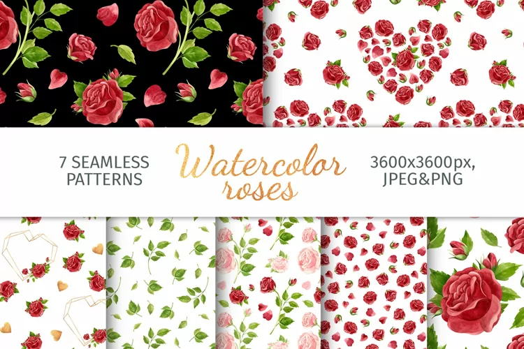 Roses seamless patterns, watercolor floral clipart.