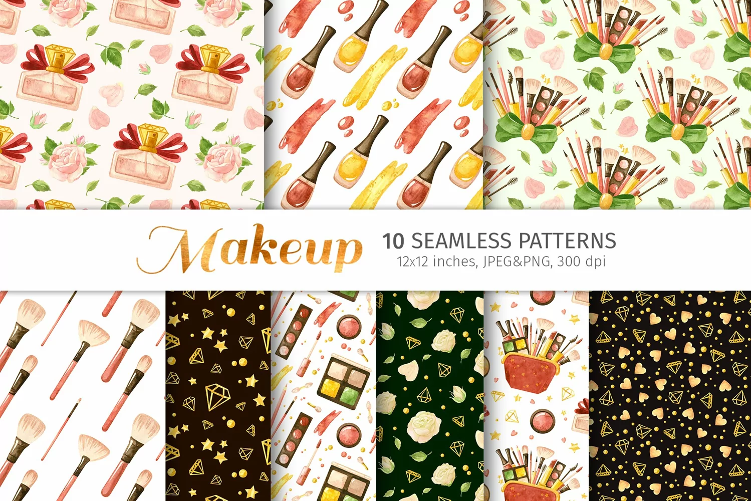Makeup - watercolor seamless patterns, glam clipart example image 1