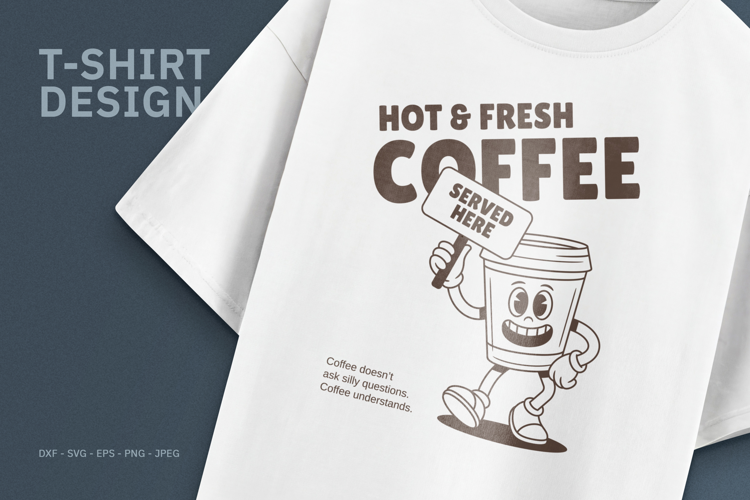 Serve up some vintage fun with this "Hot & Fresh Coffee" digital design! This charming illustration captures the classic retro cartoon aesthetic, featuring a cheerful coffee cup character holding a "Served Here" sign.