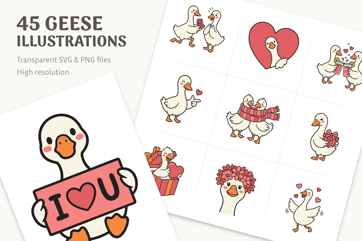 45 Cute Goose Clipart SVG & PNG, Valentine's Day Illustrations, Romantic Bird Graphics