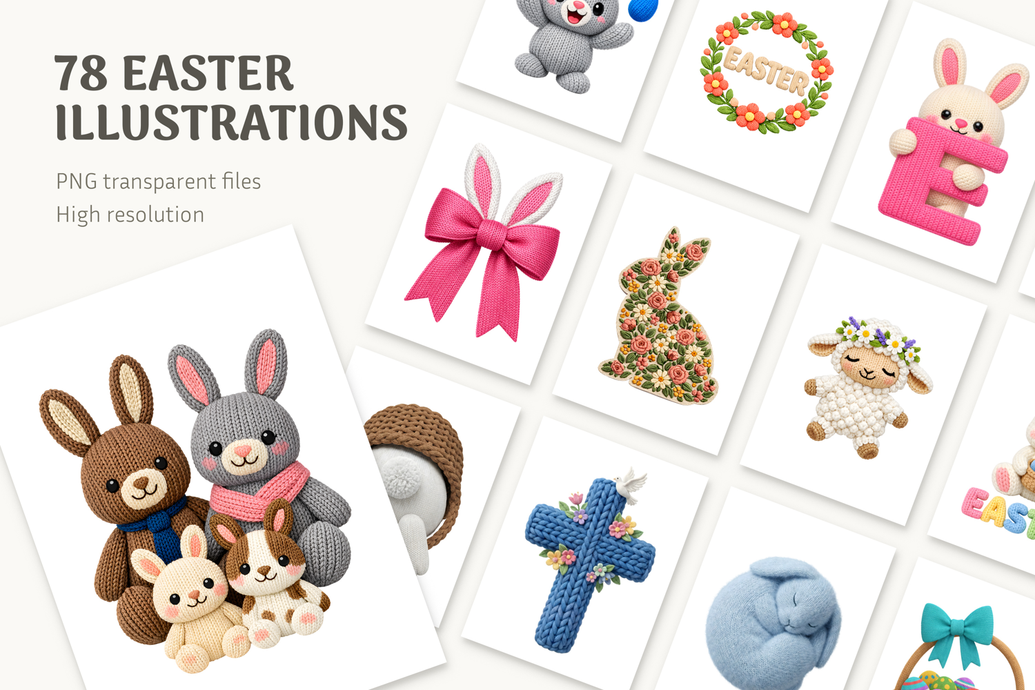 Get ready for spring with our massive bundle of 78 high-resolution Easter-themed PNG files! This collection is filled with adorable crochet and knitted-style illustrations, perfect for adding a touch of handmade charm to all your creative projects. Each design features a realistic yarn texture and a sweet, cuddly aesthetic that will bring warmth and character to your work. Ideal for crafters, designers, and business owners looking to create unique products for the Easter season and beyond.