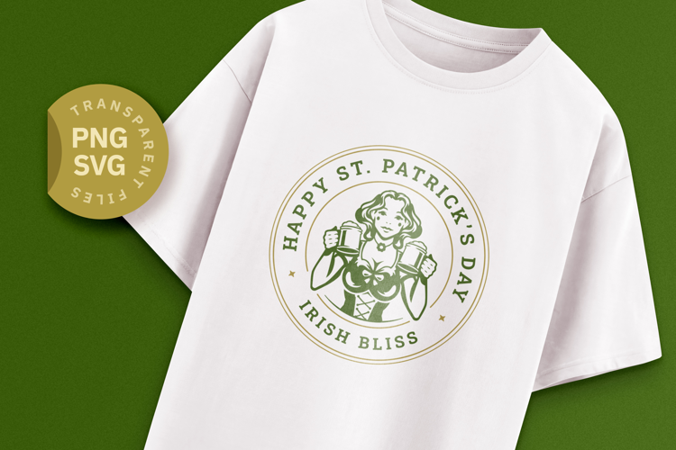Raise a glass to St. Patrick's Day with this charming and festive design! Featuring a beautiful Irish maiden holding two frothy mugs of beer, this graphic is encircled by the words "Happy St. Patrick's Day" and "Irish Bliss." It's the perfect blend of tradition and fun. This digital bundle includes two color variations, making it easy to create stunning projects on both light and dark colored materials.