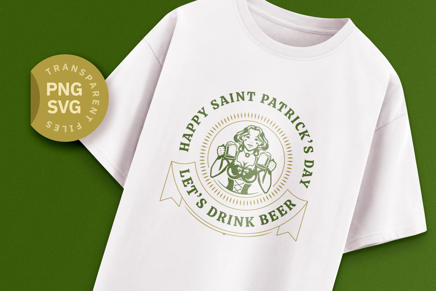 Toast to St. Patrick's Day with this fun and festive design! Featuring a charming beer maiden ready to celebrate, this artwork is perfect for creating your own custom t-shirts, mugs, party decor, and more. The design is elegantly framed in a retro-style emblem with the text "Happy Saint Patrick's Day" and "Let's Drink Beer," making it a must-have for your holiday projects.