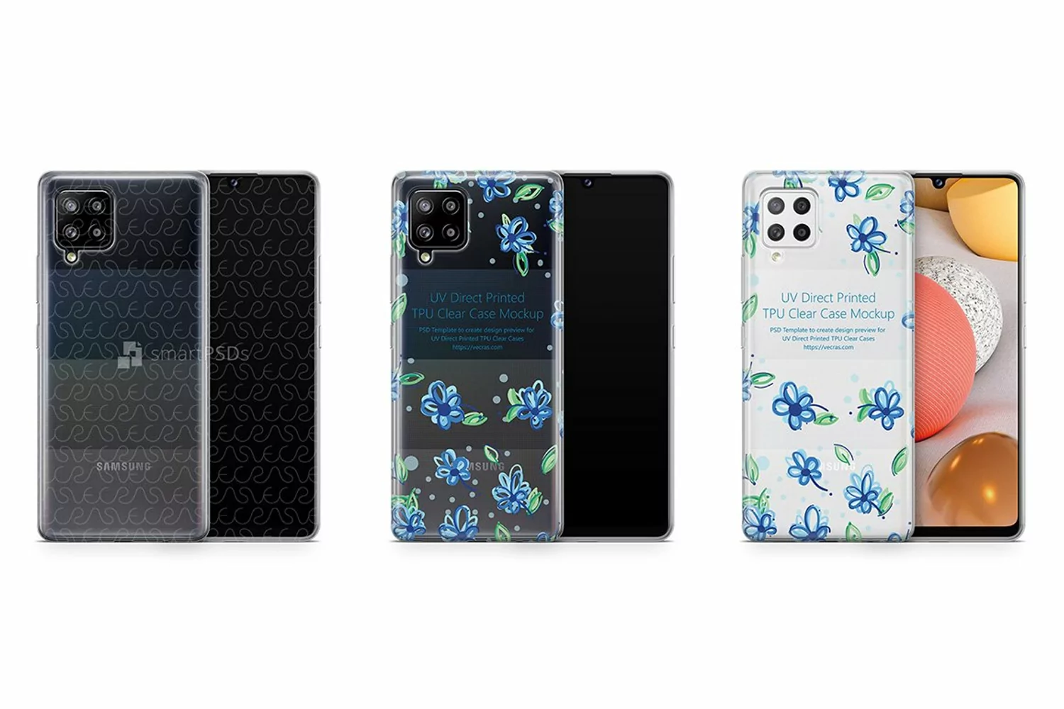 Easy to use, fully editable Galaxy A42 5G (2020) Smart PSD mockup file for making TPU Soft Case design preview, suitable for UV direct print.
